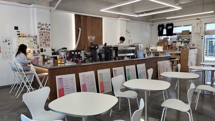 대로변이 아닌 골목 안쪽에 자리하고 있는데 건물에 부착형 간판은 없고 출입구 쪽에 입간판만 있습니다. 그래서 처음 오는 분들이 가끔 헤매기도 하죠. 실내 공간은 높은 층고에 커피 작업실같은 분위기에요. 인위적이지 않아 더욱 자연스럽고 편안한 분위기입니다. 공간이 넓고 층고가 높아 답답함이 없습니다. 미팅을 하기에도 좋고, 혼자 노트북을 펴고 일 하기에도 편한 공간이라 애정합니다.